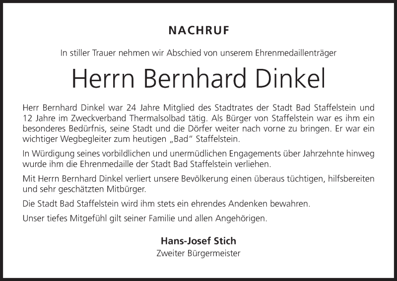 Hier finden Sie alle Traueranzeigen aus der Zeitung, die bisher für Bernhard Dinkel erschienen sind. Weitere Traueranzeigen, die in der Zeitung erscheinen, werden hier ebenfalls aufgelistet