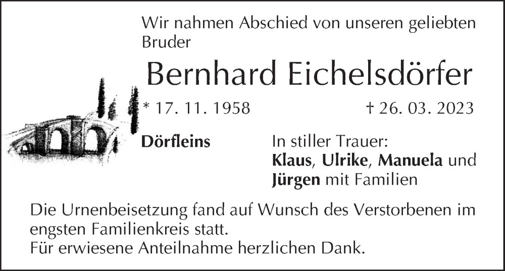 Hier finden Sie alle Traueranzeigen aus der Zeitung, die bisher für Bernhard Eichelsdörfer erschienen sind. Weitere Traueranzeigen, die in der Zeitung erscheinen, werden hier ebenfalls aufgelistet