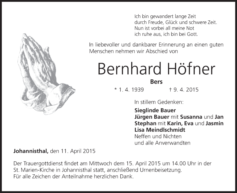 Hier finden Sie alle Traueranzeigen aus der Zeitung, die bisher für Bernhard Höfner erschienen sind. Weitere Traueranzeigen, die in der Zeitung erscheinen, werden hier ebenfalls aufgelistet
