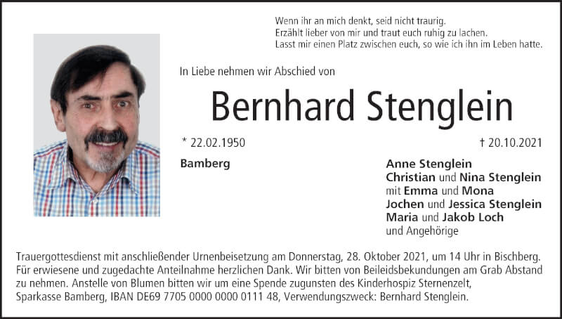 Hier finden Sie alle Traueranzeigen aus der Zeitung, die bisher für Bernhard Stenglein erschienen sind. Weitere Traueranzeigen, die in der Zeitung erscheinen, werden hier ebenfalls aufgelistet