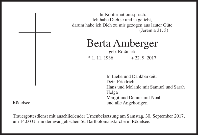 Hier finden Sie alle Traueranzeigen aus der Zeitung, die bisher für Berta Amberger erschienen sind. Weitere Traueranzeigen, die in der Zeitung erscheinen, werden hier ebenfalls aufgelistet