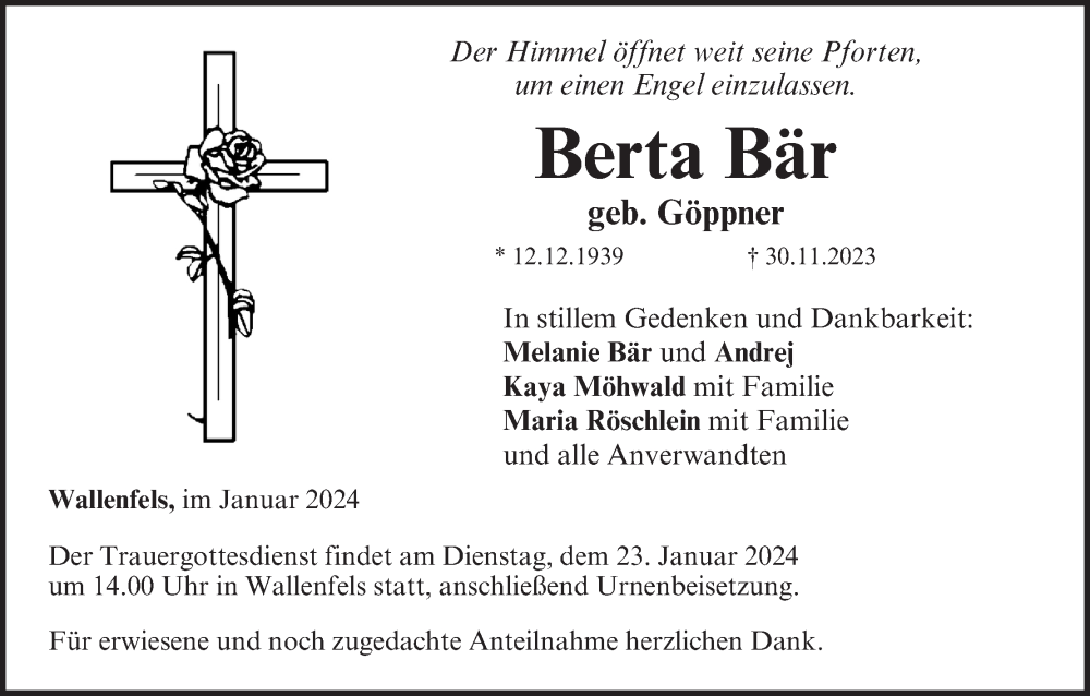 Hier finden Sie alle Traueranzeigen aus der Zeitung, die bisher für Berta Bär erschienen sind. Weitere Traueranzeigen, die in der Zeitung erscheinen, werden hier ebenfalls aufgelistet