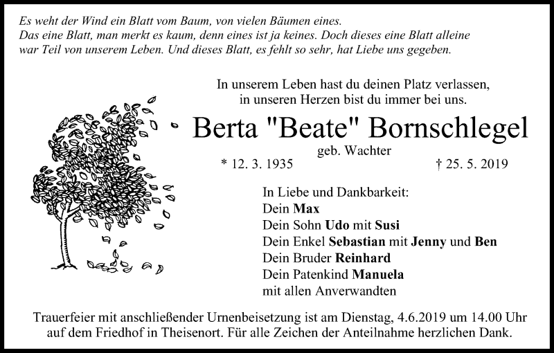 Hier finden Sie alle Traueranzeigen aus der Zeitung, die bisher für Berta Bornschlegel erschienen sind. Weitere Traueranzeigen, die in der Zeitung erscheinen, werden hier ebenfalls aufgelistet