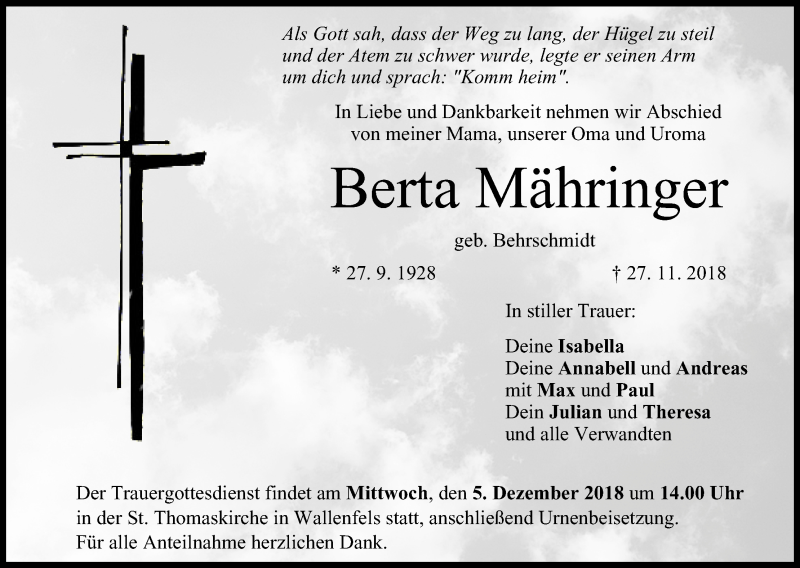 Hier finden Sie alle Traueranzeigen aus der Zeitung, die bisher für Berta Mähringer erschienen sind. Weitere Traueranzeigen, die in der Zeitung erscheinen, werden hier ebenfalls aufgelistet