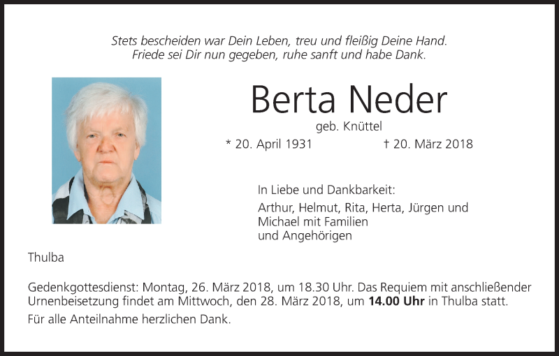 Hier finden Sie alle Traueranzeigen aus der Zeitung, die bisher für Berta Neder erschienen sind. Weitere Traueranzeigen, die in der Zeitung erscheinen, werden hier ebenfalls aufgelistet