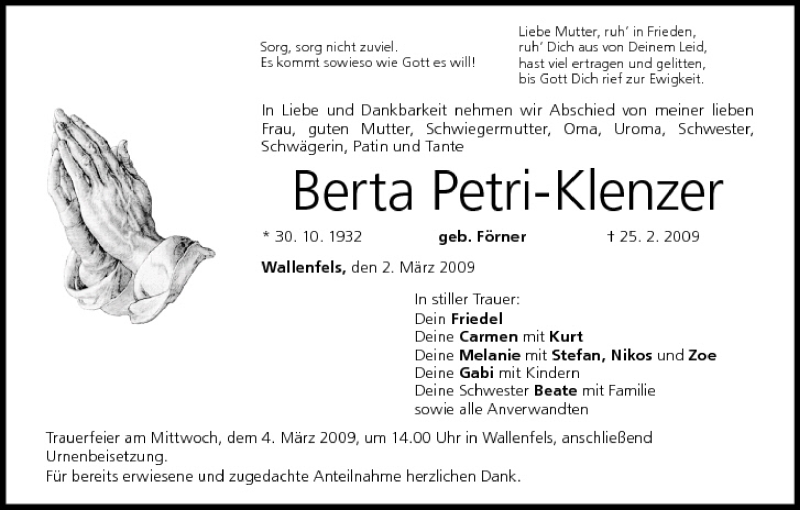 Hier finden Sie alle Traueranzeigen aus der Zeitung, die bisher für Berta Petri-Klenzer erschienen sind. Weitere Traueranzeigen, die in der Zeitung erscheinen, werden hier ebenfalls aufgelistet