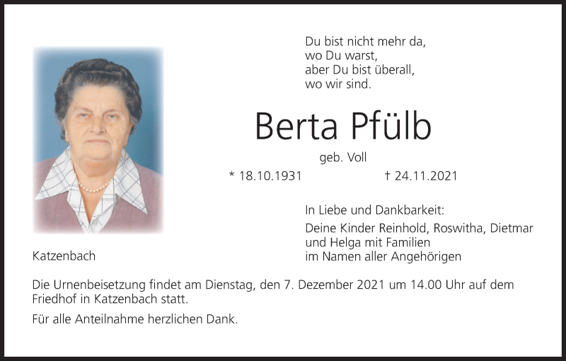 Hier finden Sie alle Traueranzeigen aus der Zeitung, die bisher für Berta Pfülb erschienen sind. Weitere Traueranzeigen, die in der Zeitung erscheinen, werden hier ebenfalls aufgelistet