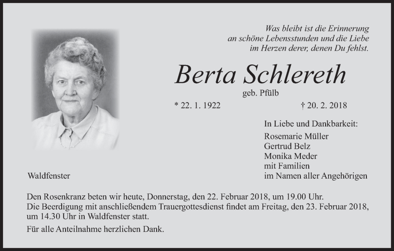 Hier finden Sie alle Traueranzeigen aus der Zeitung, die bisher für Berta Schlereth erschienen sind. Weitere Traueranzeigen, die in der Zeitung erscheinen, werden hier ebenfalls aufgelistet