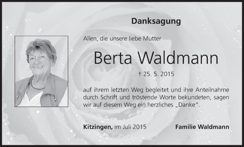 Hier finden Sie alle Traueranzeigen aus der Zeitung, die bisher für Berta Waldmann erschienen sind. Weitere Traueranzeigen, die in der Zeitung erscheinen, werden hier ebenfalls aufgelistet