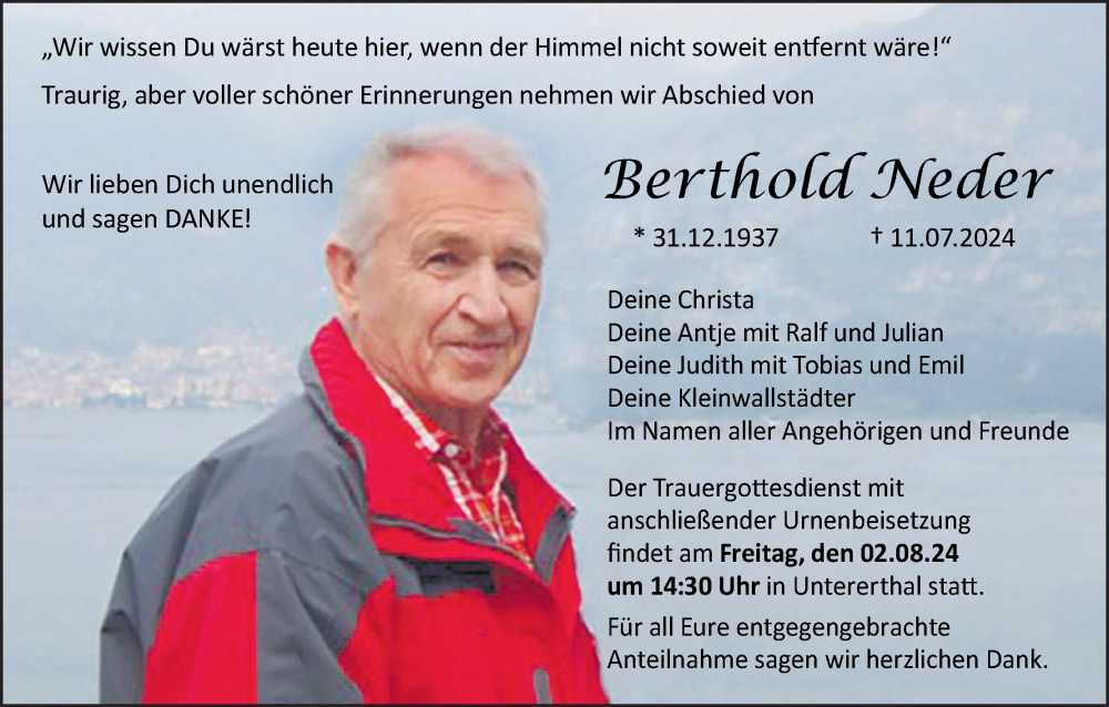 Hier finden Sie alle Traueranzeigen aus der Zeitung, die bisher für Berthold Neder erschienen sind. Weitere Traueranzeigen, die in der Zeitung erscheinen, werden hier ebenfalls aufgelistet