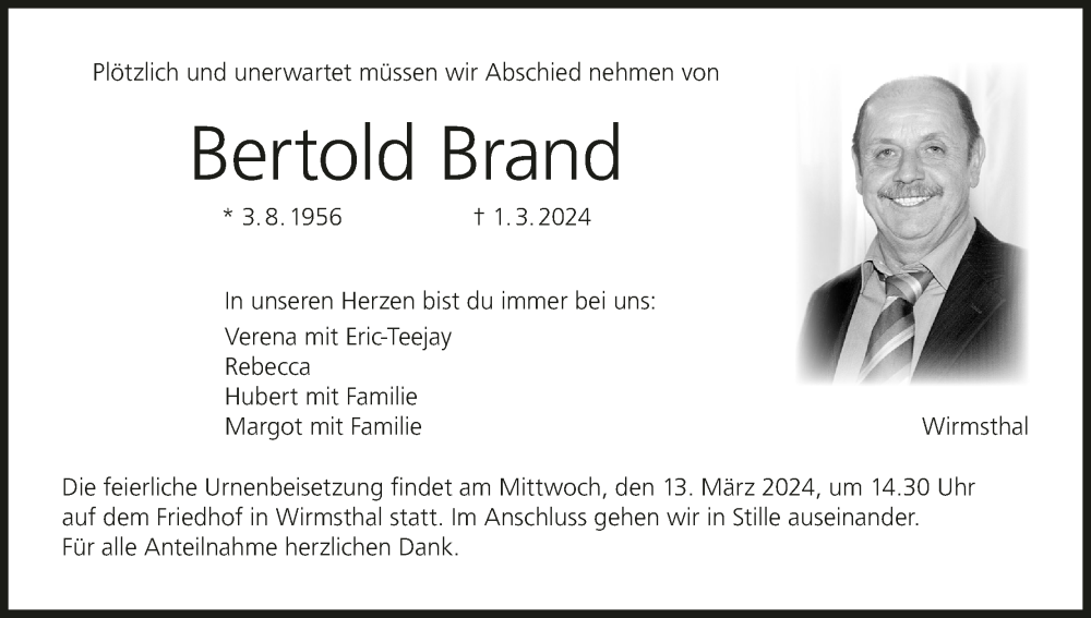 Hier finden Sie alle Traueranzeigen aus der Zeitung, die bisher für Bertold Brand erschienen sind. Weitere Traueranzeigen, die in der Zeitung erscheinen, werden hier ebenfalls aufgelistet