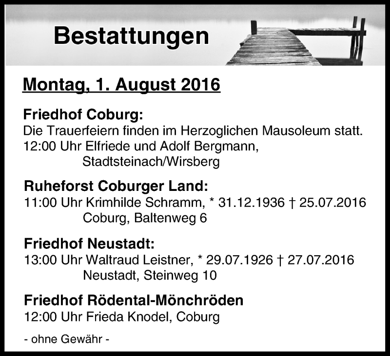 Hier finden Sie alle Traueranzeigen aus der Zeitung, die bisher für Bestattungen vom 01.08.2016 erschienen sind. Weitere Traueranzeigen, die in der Zeitung erscheinen, werden hier ebenfalls aufgelistet