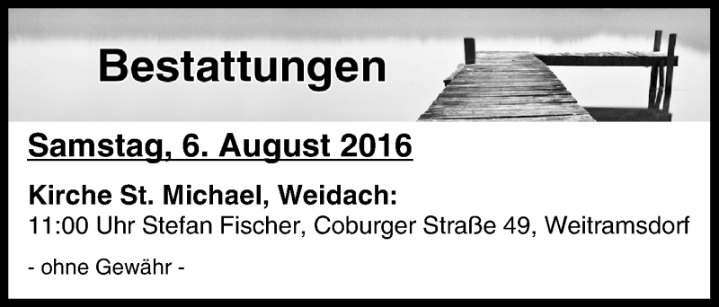 Hier finden Sie alle Traueranzeigen aus der Zeitung, die bisher für Bestattungen vom 06.08.2016 erschienen sind. Weitere Traueranzeigen, die in der Zeitung erscheinen, werden hier ebenfalls aufgelistet