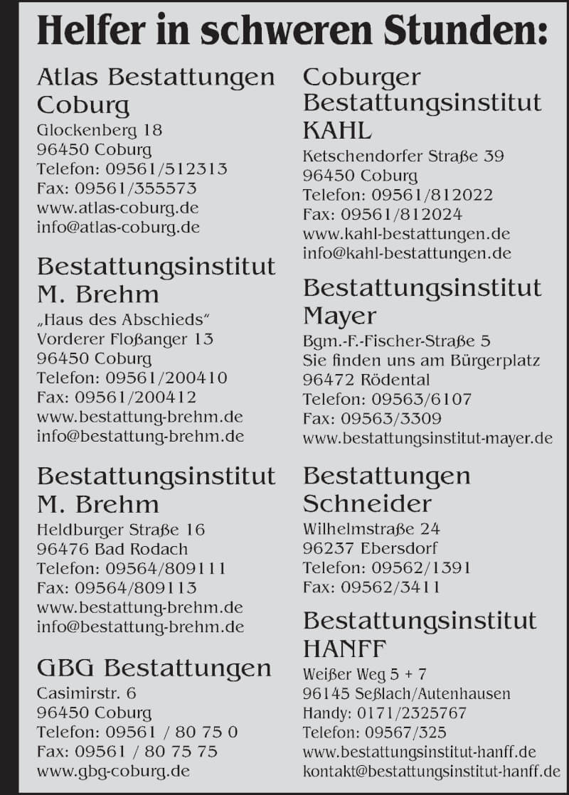 Hier finden Sie alle Traueranzeigen aus der Zeitung, die bisher für Bestattungsinstitute erschienen sind. Weitere Traueranzeigen, die in der Zeitung erscheinen, werden hier ebenfalls aufgelistet