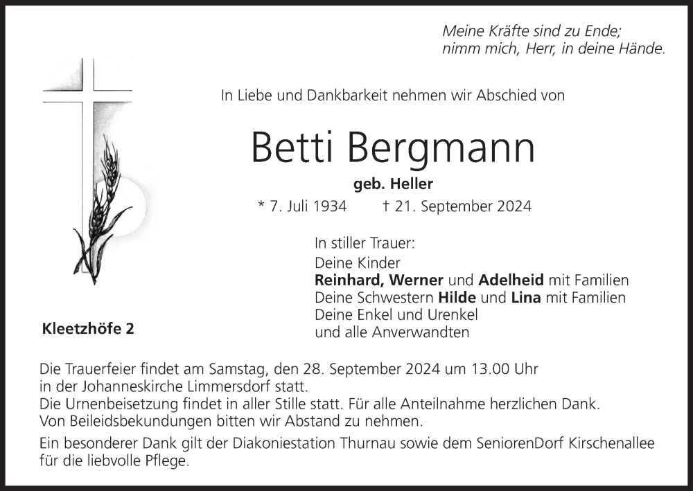 Hier finden Sie alle Traueranzeigen aus der Zeitung, die bisher für Betti Bergmann erschienen sind. Weitere Traueranzeigen, die in der Zeitung erscheinen, werden hier ebenfalls aufgelistet