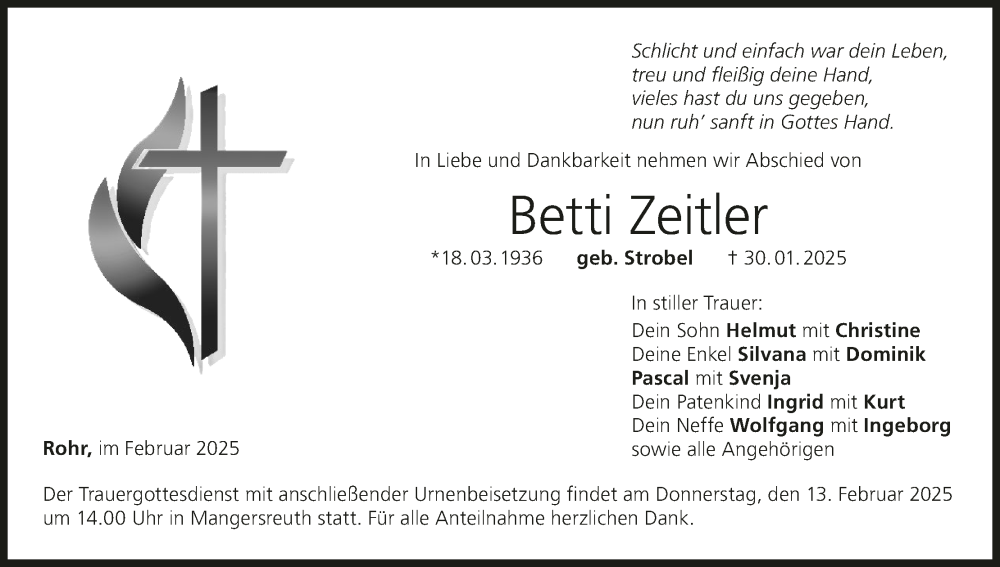 Hier finden Sie alle Traueranzeigen aus der Zeitung, die bisher für Betti Zeitler erschienen sind. Weitere Traueranzeigen, die in der Zeitung erscheinen, werden hier ebenfalls aufgelistet