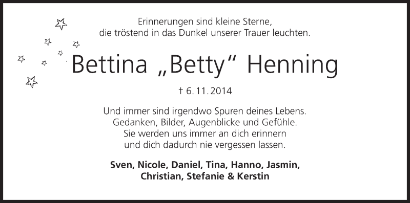Hier finden Sie alle Traueranzeigen aus der Zeitung, die bisher für Bettina Henning erschienen sind. Weitere Traueranzeigen, die in der Zeitung erscheinen, werden hier ebenfalls aufgelistet