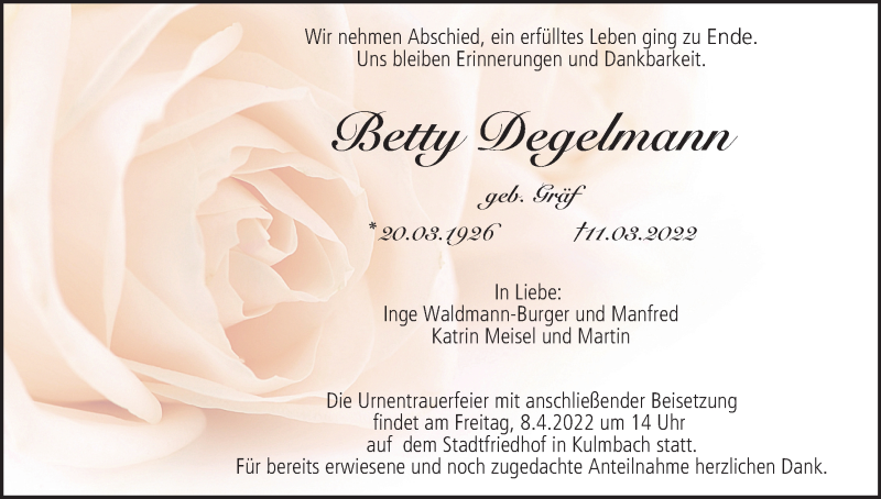Hier finden Sie alle Traueranzeigen aus der Zeitung, die bisher für Betty Degelmann erschienen sind. Weitere Traueranzeigen, die in der Zeitung erscheinen, werden hier ebenfalls aufgelistet