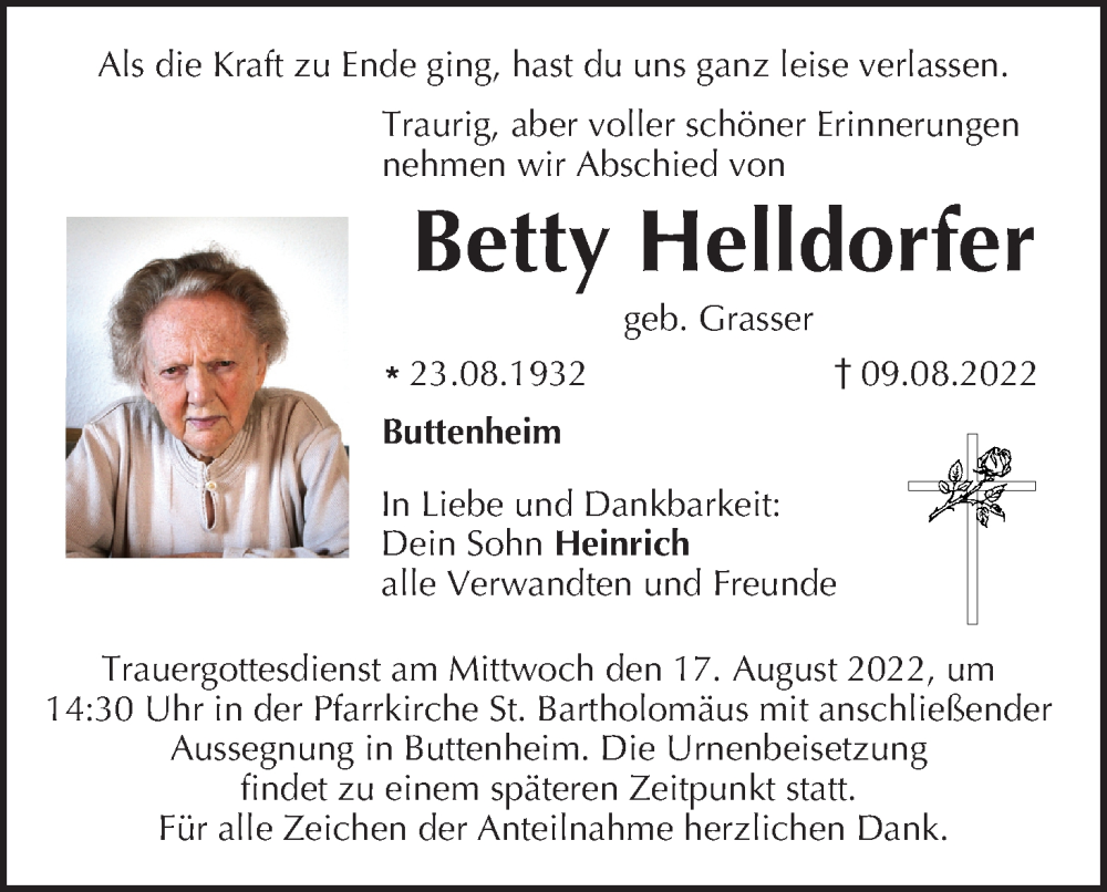 Hier finden Sie alle Traueranzeigen aus der Zeitung, die bisher für Betty Helldorfer erschienen sind. Weitere Traueranzeigen, die in der Zeitung erscheinen, werden hier ebenfalls aufgelistet