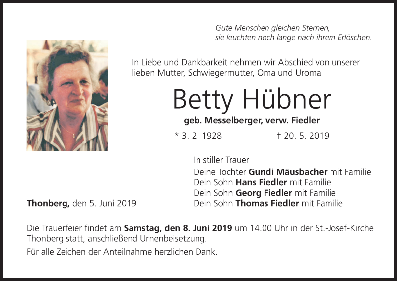 Hier finden Sie alle Traueranzeigen aus der Zeitung, die bisher für Betty Hübner erschienen sind. Weitere Traueranzeigen, die in der Zeitung erscheinen, werden hier ebenfalls aufgelistet