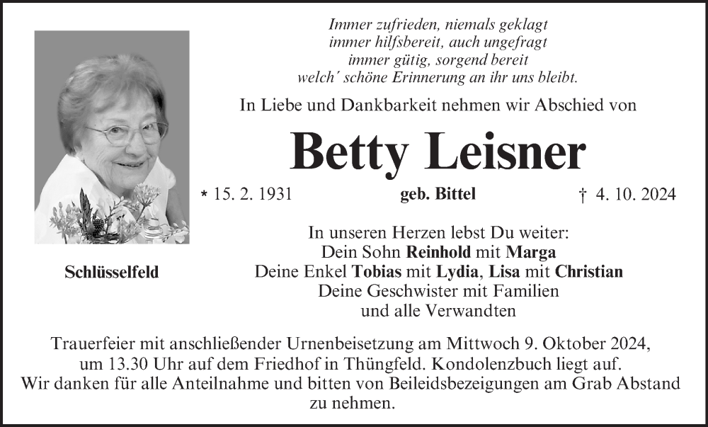 Hier finden Sie alle Traueranzeigen aus der Zeitung, die bisher für Betty Leisner erschienen sind. Weitere Traueranzeigen, die in der Zeitung erscheinen, werden hier ebenfalls aufgelistet
