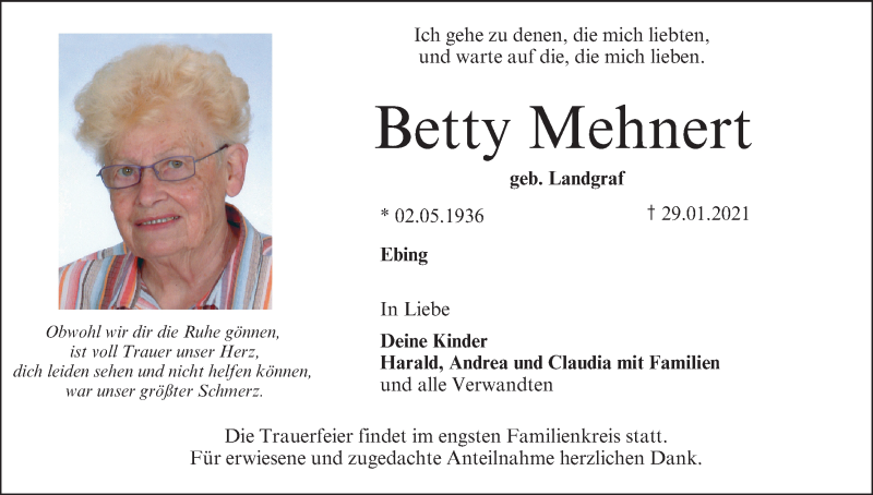 Hier finden Sie alle Traueranzeigen aus der Zeitung, die bisher für Betty Mehnert erschienen sind. Weitere Traueranzeigen, die in der Zeitung erscheinen, werden hier ebenfalls aufgelistet