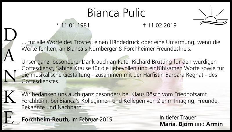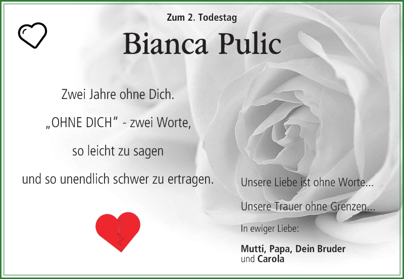 Hier finden Sie alle Traueranzeigen aus der Zeitung, die bisher für Bianca Pulic erschienen sind. Weitere Traueranzeigen, die in der Zeitung erscheinen, werden hier ebenfalls aufgelistet
