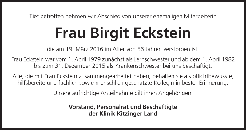 Hier finden Sie alle Traueranzeigen aus der Zeitung, die bisher für Birgit Eckstein erschienen sind. Weitere Traueranzeigen, die in der Zeitung erscheinen, werden hier ebenfalls aufgelistet
