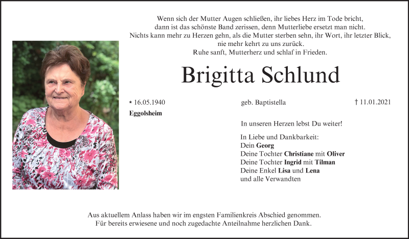 Hier finden Sie alle Traueranzeigen aus der Zeitung, die bisher für Brigitta Schlund erschienen sind. Weitere Traueranzeigen, die in der Zeitung erscheinen, werden hier ebenfalls aufgelistet