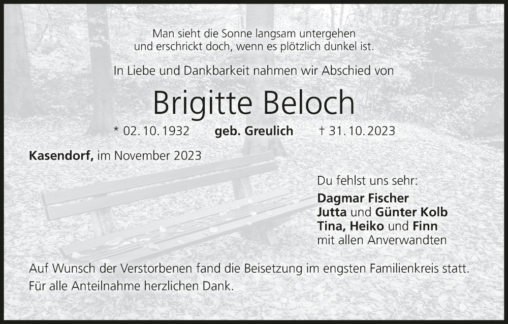 Hier finden Sie alle Traueranzeigen aus der Zeitung, die bisher für Brigitte Beloch erschienen sind. Weitere Traueranzeigen, die in der Zeitung erscheinen, werden hier ebenfalls aufgelistet