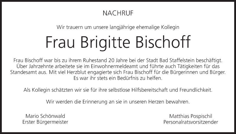 Hier finden Sie alle Traueranzeigen aus der Zeitung, die bisher für Brigitte Bischoff erschienen sind. Weitere Traueranzeigen, die in der Zeitung erscheinen, werden hier ebenfalls aufgelistet