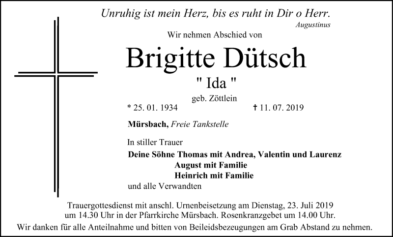 Hier finden Sie alle Traueranzeigen aus der Zeitung, die bisher für Brigitte Dütsch erschienen sind. Weitere Traueranzeigen, die in der Zeitung erscheinen, werden hier ebenfalls aufgelistet