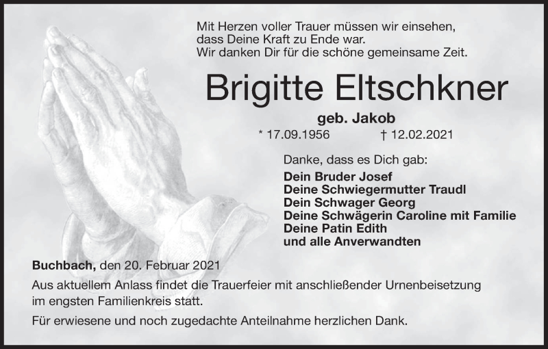 Hier finden Sie alle Traueranzeigen aus der Zeitung, die bisher für Brigitte Eltschkner erschienen sind. Weitere Traueranzeigen, die in der Zeitung erscheinen, werden hier ebenfalls aufgelistet