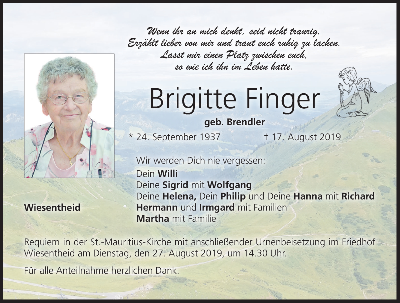 Hier finden Sie alle Traueranzeigen aus der Zeitung, die bisher für Brigitte Finger erschienen sind. Weitere Traueranzeigen, die in der Zeitung erscheinen, werden hier ebenfalls aufgelistet