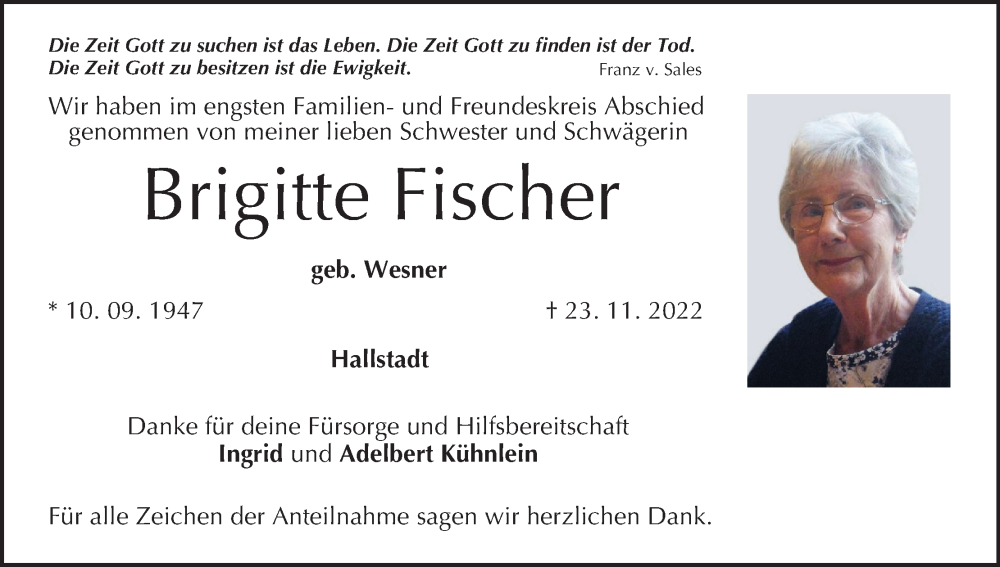 Hier finden Sie alle Traueranzeigen aus der Zeitung, die bisher für Brigitte Fischer erschienen sind. Weitere Traueranzeigen, die in der Zeitung erscheinen, werden hier ebenfalls aufgelistet