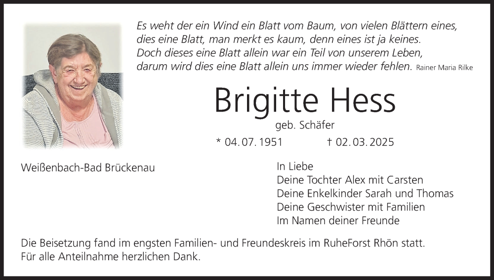 Hier finden Sie alle Traueranzeigen aus der Zeitung, die bisher für Brigitte Hess erschienen sind. Weitere Traueranzeigen, die in der Zeitung erscheinen, werden hier ebenfalls aufgelistet