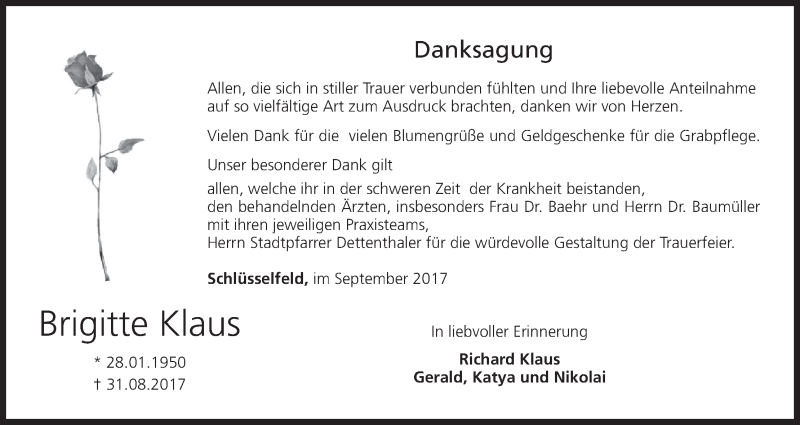 Hier finden Sie alle Traueranzeigen aus der Zeitung, die bisher für Brigitte Klaus erschienen sind. Weitere Traueranzeigen, die in der Zeitung erscheinen, werden hier ebenfalls aufgelistet