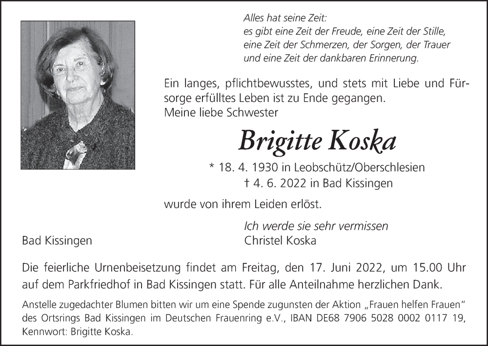 Hier finden Sie alle Traueranzeigen aus der Zeitung, die bisher für Brigitte Koska erschienen sind. Weitere Traueranzeigen, die in der Zeitung erscheinen, werden hier ebenfalls aufgelistet