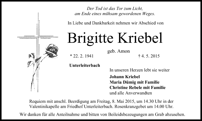 Hier finden Sie alle Traueranzeigen aus der Zeitung, die bisher für Brigitte Kriebel erschienen sind. Weitere Traueranzeigen, die in der Zeitung erscheinen, werden hier ebenfalls aufgelistet