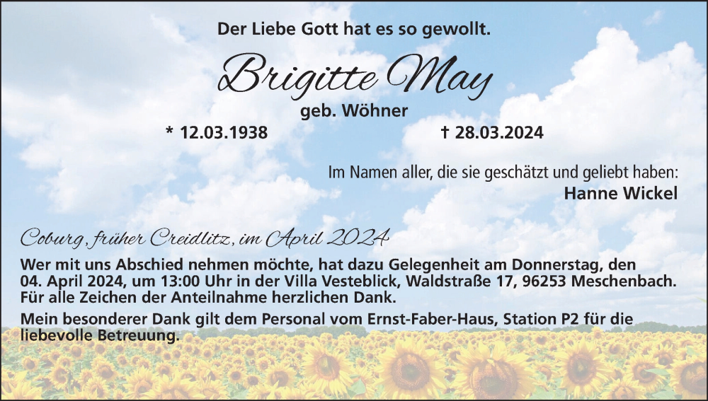 Hier finden Sie alle Traueranzeigen aus der Zeitung, die bisher für Brigitte May erschienen sind. Weitere Traueranzeigen, die in der Zeitung erscheinen, werden hier ebenfalls aufgelistet
