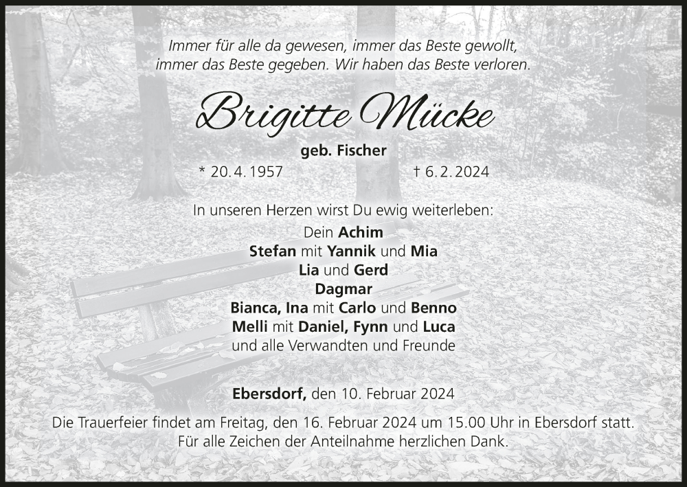 Hier finden Sie alle Traueranzeigen aus der Zeitung, die bisher für Brigitte Mücke erschienen sind. Weitere Traueranzeigen, die in der Zeitung erscheinen, werden hier ebenfalls aufgelistet