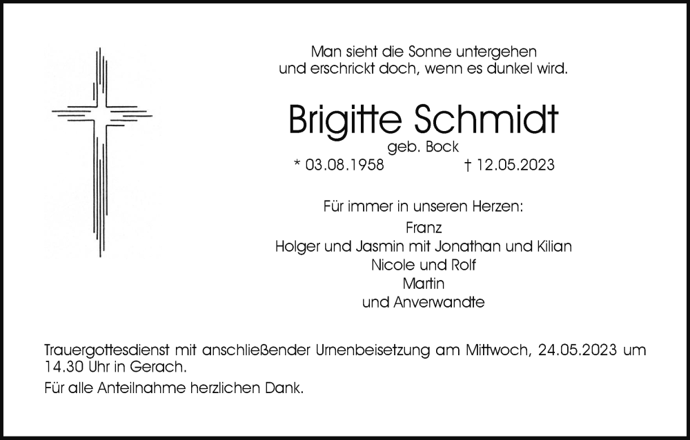 Hier finden Sie alle Traueranzeigen aus der Zeitung, die bisher für Brigitte Schmidt erschienen sind. Weitere Traueranzeigen, die in der Zeitung erscheinen, werden hier ebenfalls aufgelistet