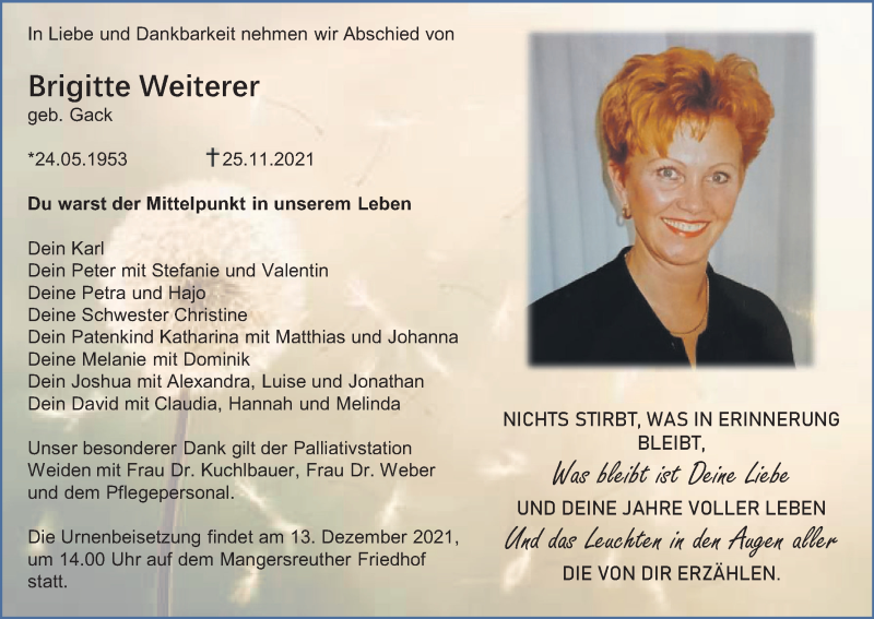 Hier finden Sie alle Traueranzeigen aus der Zeitung, die bisher für Brigitte Weiterer erschienen sind. Weitere Traueranzeigen, die in der Zeitung erscheinen, werden hier ebenfalls aufgelistet
