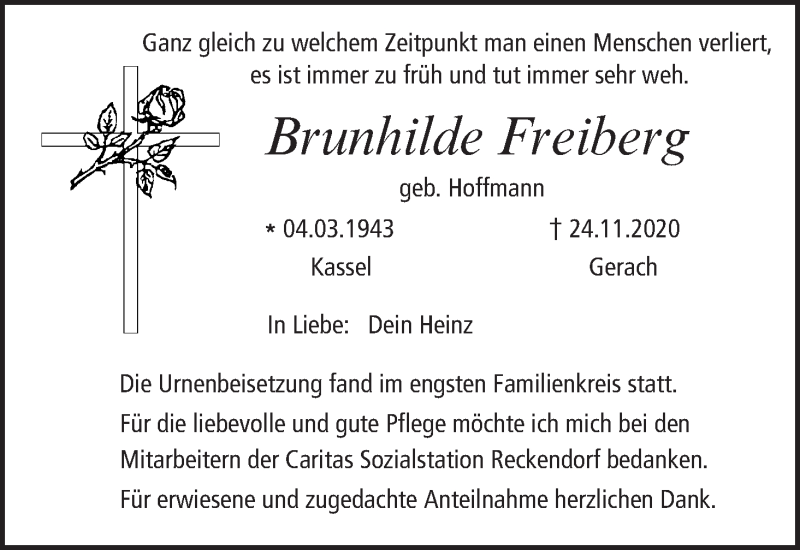 Hier finden Sie alle Traueranzeigen aus der Zeitung, die bisher für Brunhilde Freiberg erschienen sind. Weitere Traueranzeigen, die in der Zeitung erscheinen, werden hier ebenfalls aufgelistet