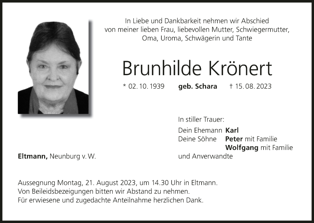 Hier finden Sie alle Traueranzeigen aus der Zeitung, die bisher für Brunhilde Krönert erschienen sind. Weitere Traueranzeigen, die in der Zeitung erscheinen, werden hier ebenfalls aufgelistet
