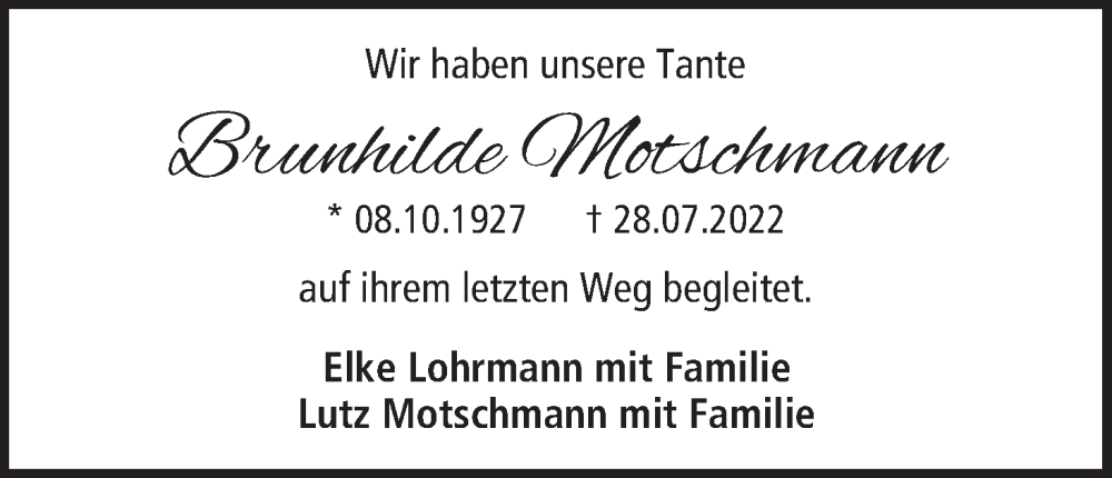 Hier finden Sie alle Traueranzeigen aus der Zeitung, die bisher für Brunhilde Motschmann erschienen sind. Weitere Traueranzeigen, die in der Zeitung erscheinen, werden hier ebenfalls aufgelistet