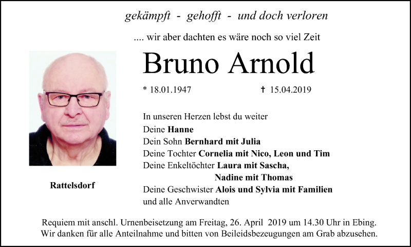 Hier finden Sie alle Traueranzeigen aus der Zeitung, die bisher für Bruno Arnold erschienen sind. Weitere Traueranzeigen, die in der Zeitung erscheinen, werden hier ebenfalls aufgelistet