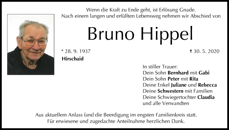 Hier finden Sie alle Traueranzeigen aus der Zeitung, die bisher für Bruno Hippel erschienen sind. Weitere Traueranzeigen, die in der Zeitung erscheinen, werden hier ebenfalls aufgelistet