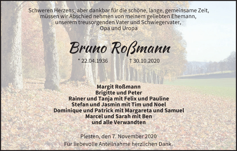 Hier finden Sie alle Traueranzeigen aus der Zeitung, die bisher für Bruno Roßmann erschienen sind. Weitere Traueranzeigen, die in der Zeitung erscheinen, werden hier ebenfalls aufgelistet