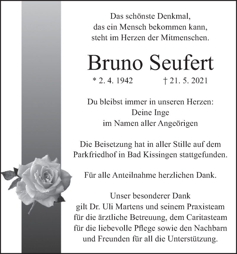 Hier finden Sie alle Traueranzeigen aus der Zeitung, die bisher für Bruno Seufert erschienen sind. Weitere Traueranzeigen, die in der Zeitung erscheinen, werden hier ebenfalls aufgelistet